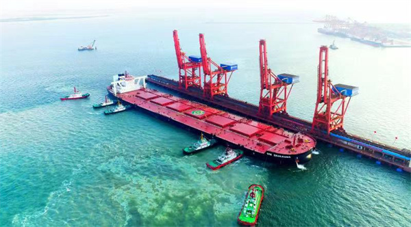 圖為滿載鐵礦石的40萬噸「礦石湛江」輪首次成功靠泊湛江港40萬噸散貨碼頭