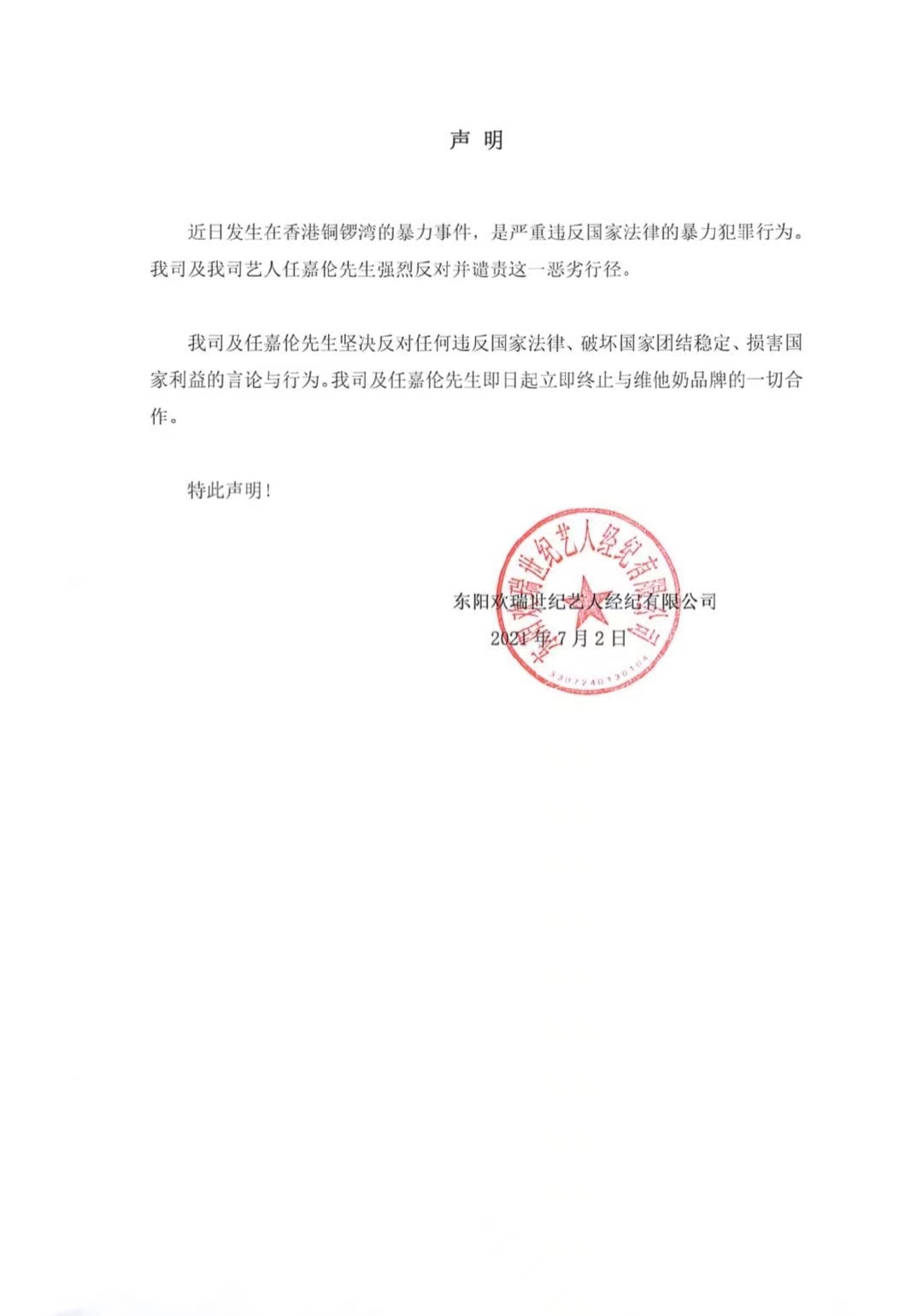 任嘉倫的經紀公司歡瑞世紀隨後亦發聲明,宣布任嘉倫已終止與「維他奶」品牌的一切合作。聲明稱,「近日發生在香港銅鑼灣的暴力事件,是嚴重違反國家法律的暴力犯罪行為。我司及我司藝人任嘉倫先生強烈反對並譴責這一惡劣行徑。」「我司及任嘉倫先生堅決反對任何違反國家法律、破壞國家團結穩定、損害國家利益的言論與行為。我司及任嘉倫先生即日起立即終止與維他奶品牌的一切合作。」