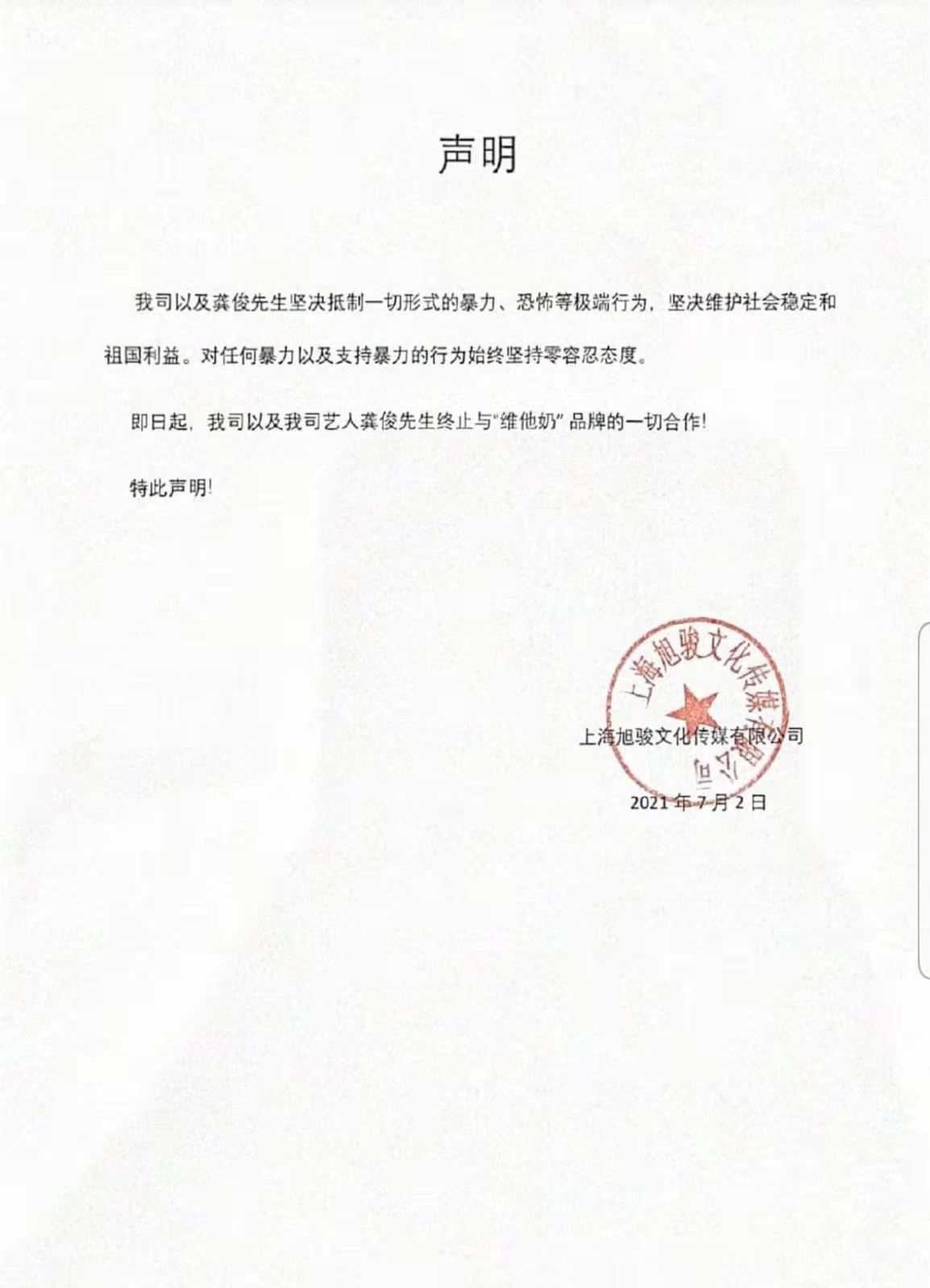 龔俊工作室晚上發表聲明,宣布終止與「維他奶」品牌的一切合作。聲明稱,「我司以及龔俊先生堅決抵制一切形式的暴力、恐怖等極端行為,堅決維護社會穩定和國家利益。對任何暴力以及支持暴力的行為始終堅持零容忍態度」。