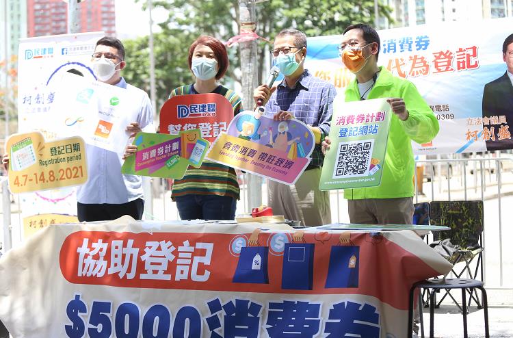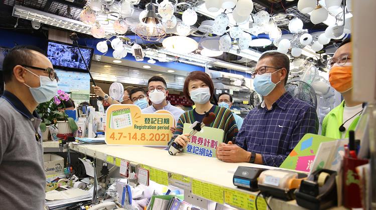 政府的5000元電子消費券發放計劃於今日(4日)起接受申請,民建聯主席李慧琼、立法會議員柯創盛與劉國勳邀請到財政司司長陳茂波到訪觀塘區宣傳消費劵登記計劃和了解商戶及市民使用電子支付的情況。