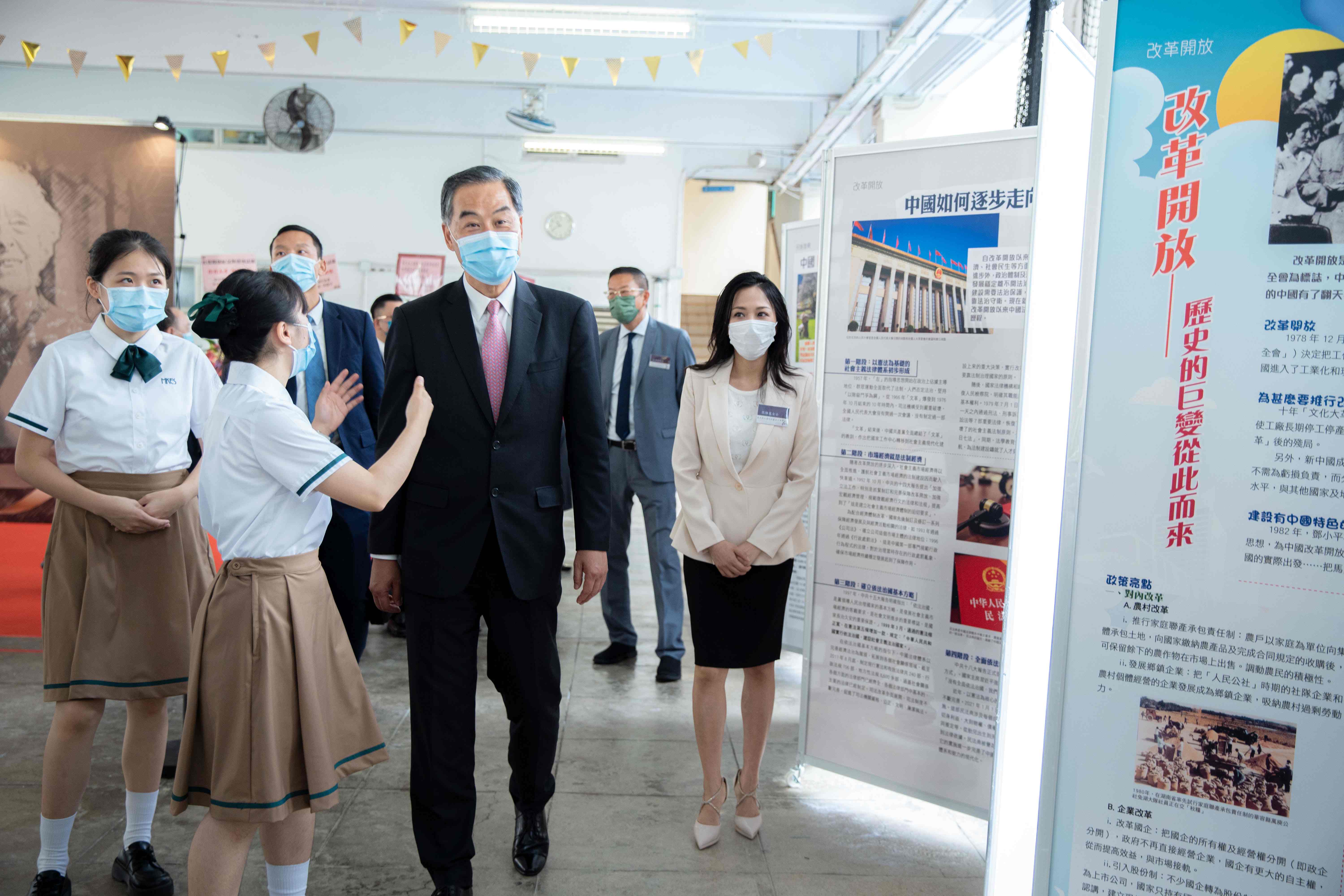 學生向梁振英(左三)、張雅麗(左四)介紹圖片內容。