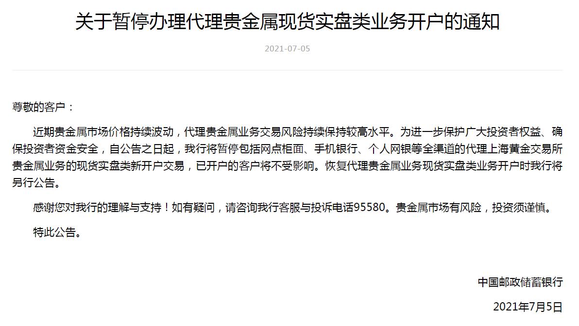 郵儲銀行表示,近期貴金屬市場價格持續波動,代理貴金屬業務交易風險持續保持較高水平,此舉是為進一步保護廣大投資者權益、確保投資者資金安全。恢復代理貴金屬業務現貨實盤類業務開戶時將另行公告。