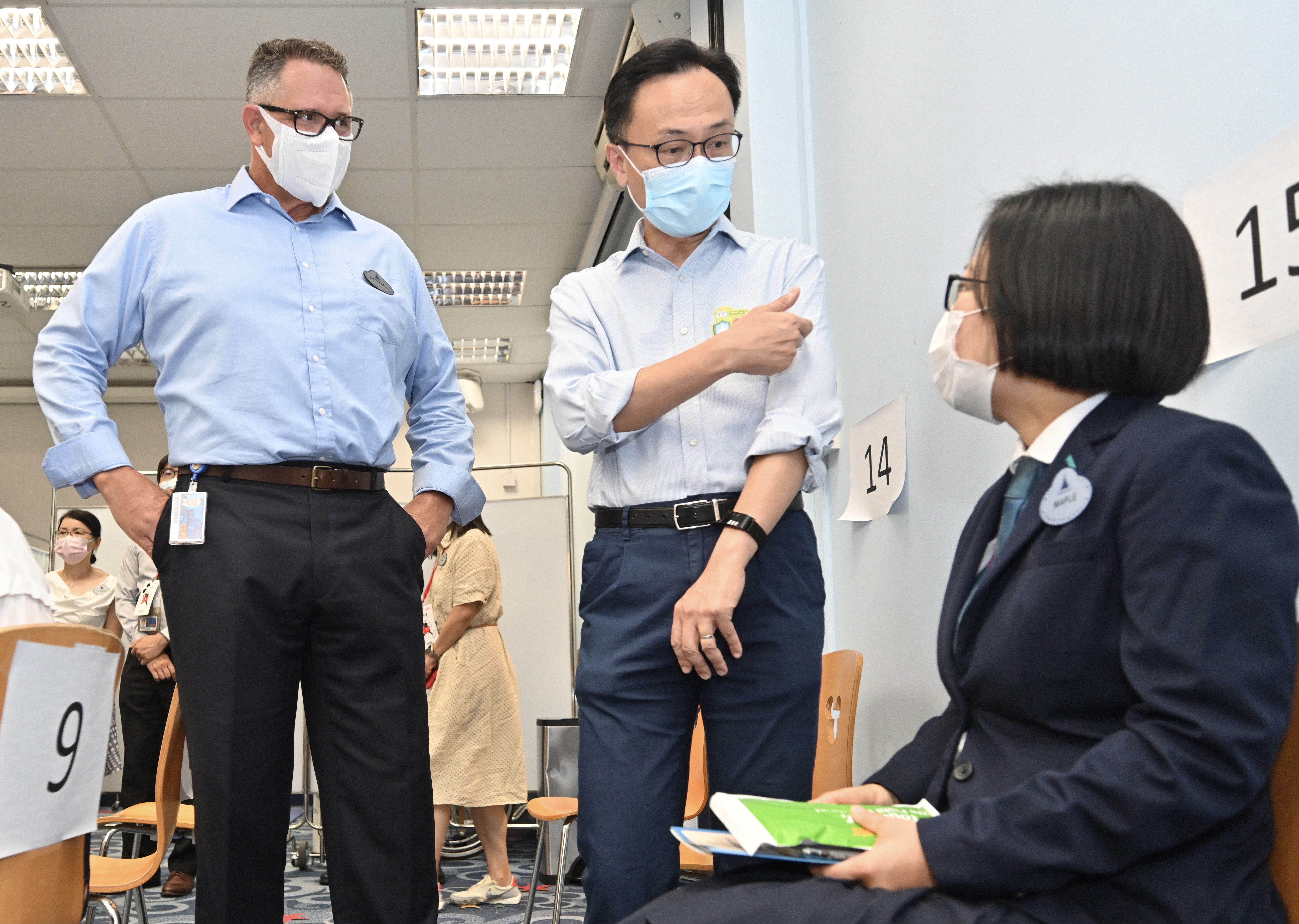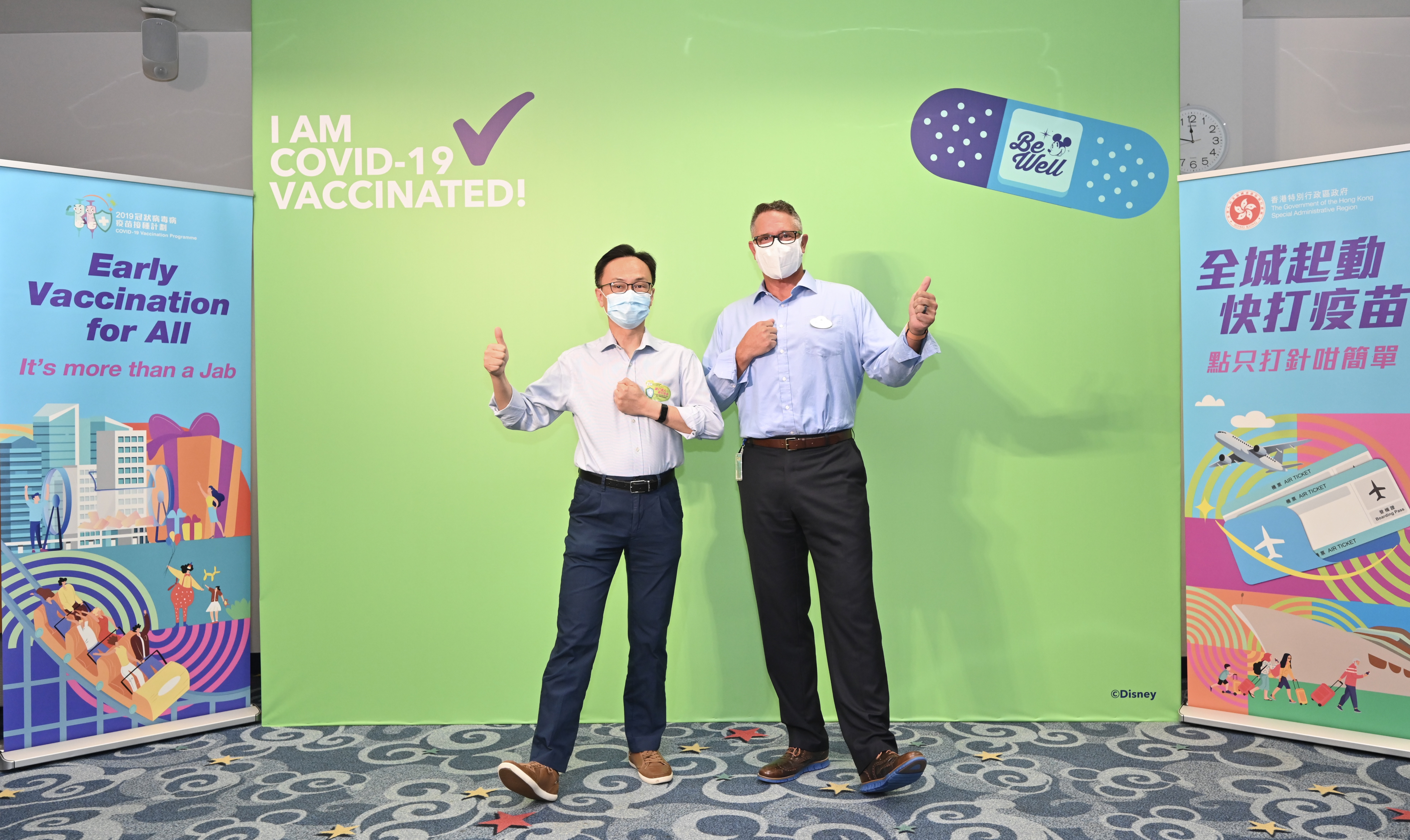 聶德權指出,除「疫苗假期」外,迪士尼為了今次的接種,事前做了多項準備,包括舉辦講座,解答員工有關接種的疑問、個人健康諮詢服務,還有疫苗注射前檢查等。他說,今日有不少年輕職員接種疫苗,他與來自餐飲部及保安部等職員交流,部分人反映家人已接種,期待盡快通關可往返內地,另有人因平日工作須接觸不同人士,希望接種能加強對自己的保護。