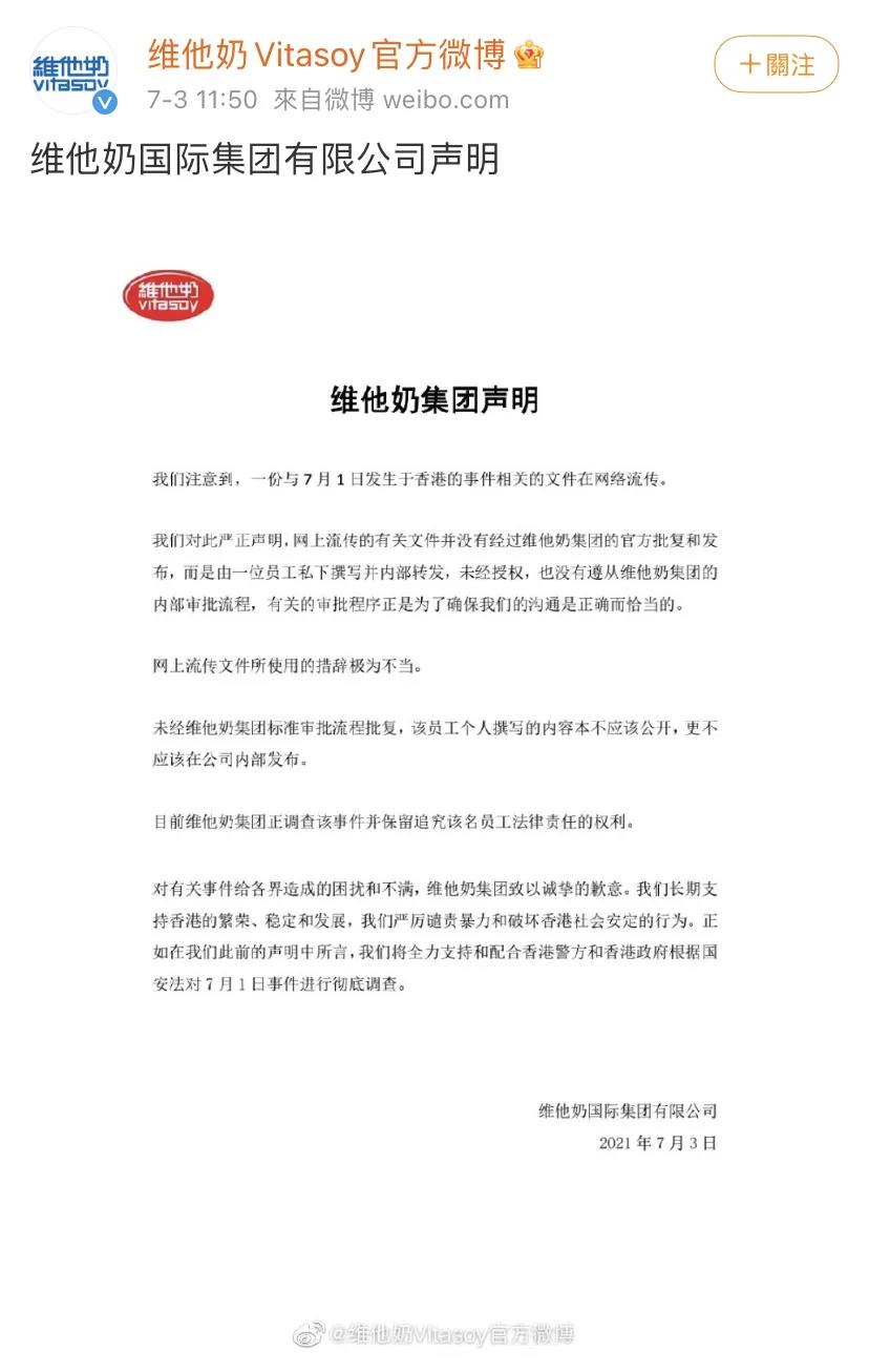 網民聲討如潮涌,維他奶也坐不住了,在7月3日淩晨,維他奶國際在官方微博發布聲明,表示集團支持香港當局根據國安法對案件進行全面調查,而中國內地運營的維他奶有限公司,會致力支持中國內地和香港的穩定、繁榮和發展。而該聲明亦關閉微博的留言功能。