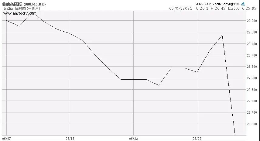 有網民還質疑,維他奶的隨後撇清的聲明比內部公告還不似官方,因內部公告還有檔案編號,聲明連公司蓋章都沒有。維他奶的「敷衍」了事並未平息網民憤怒,7月5日,資本市場也給維他奶一份「大禮」,那就是暴跌的股價。