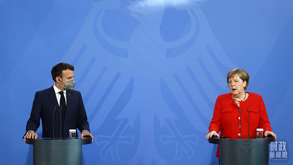 2021年6月18日,默克爾在柏林會見了馬克龍。他們共同表示,目前還不能過早宣告疫情結束。(圖源:視覺中國)