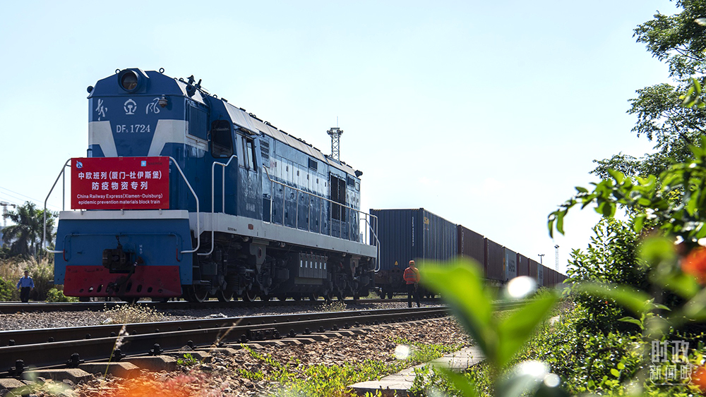 2021年4月21日,一列滿載防疫物資的中歐班列,由廈門海滄站發往德國杜伊斯堡。(圖源:視覺中國)
