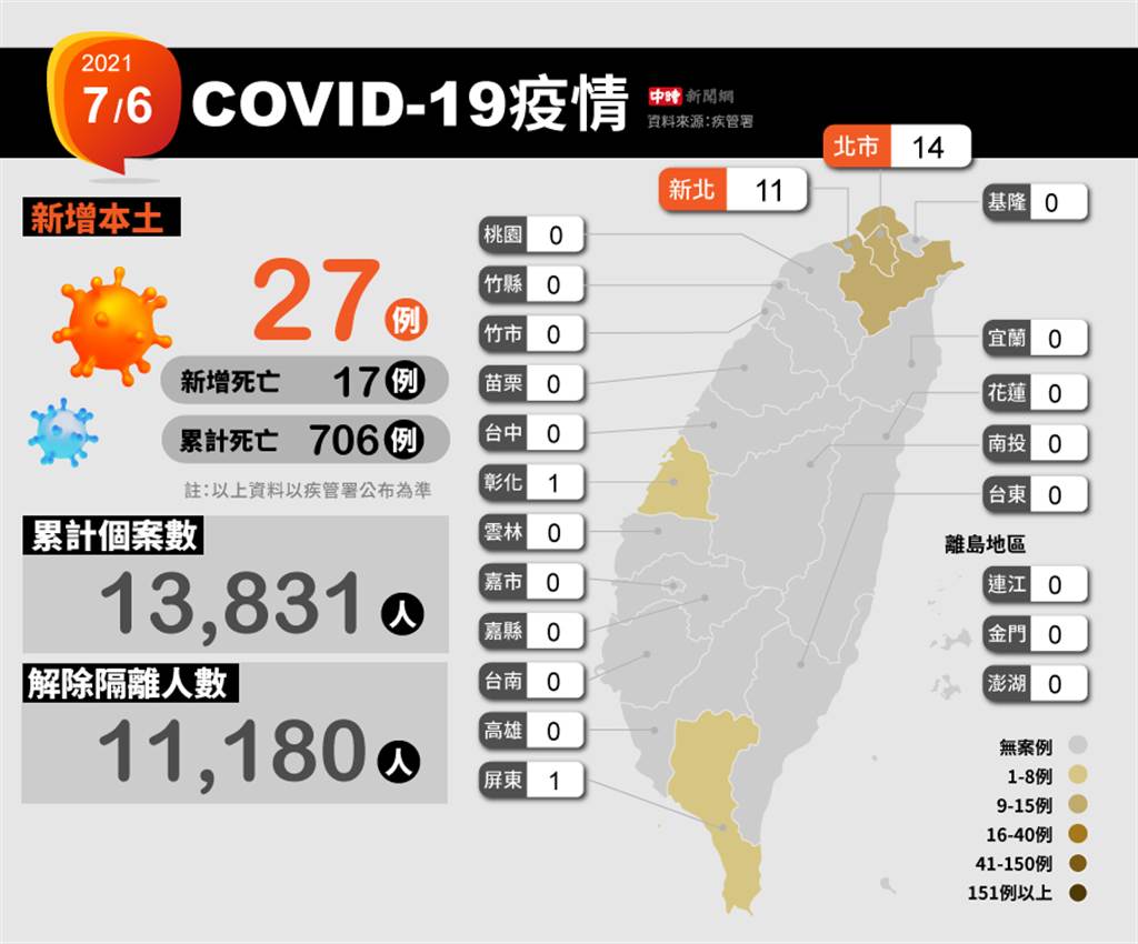 截至目前,台灣累計確診病例15088例,其中本土病例13846例。自2020年起,累計706例死亡病例,其中本土病例698例。(圖源:指揮中心提供、台媒)