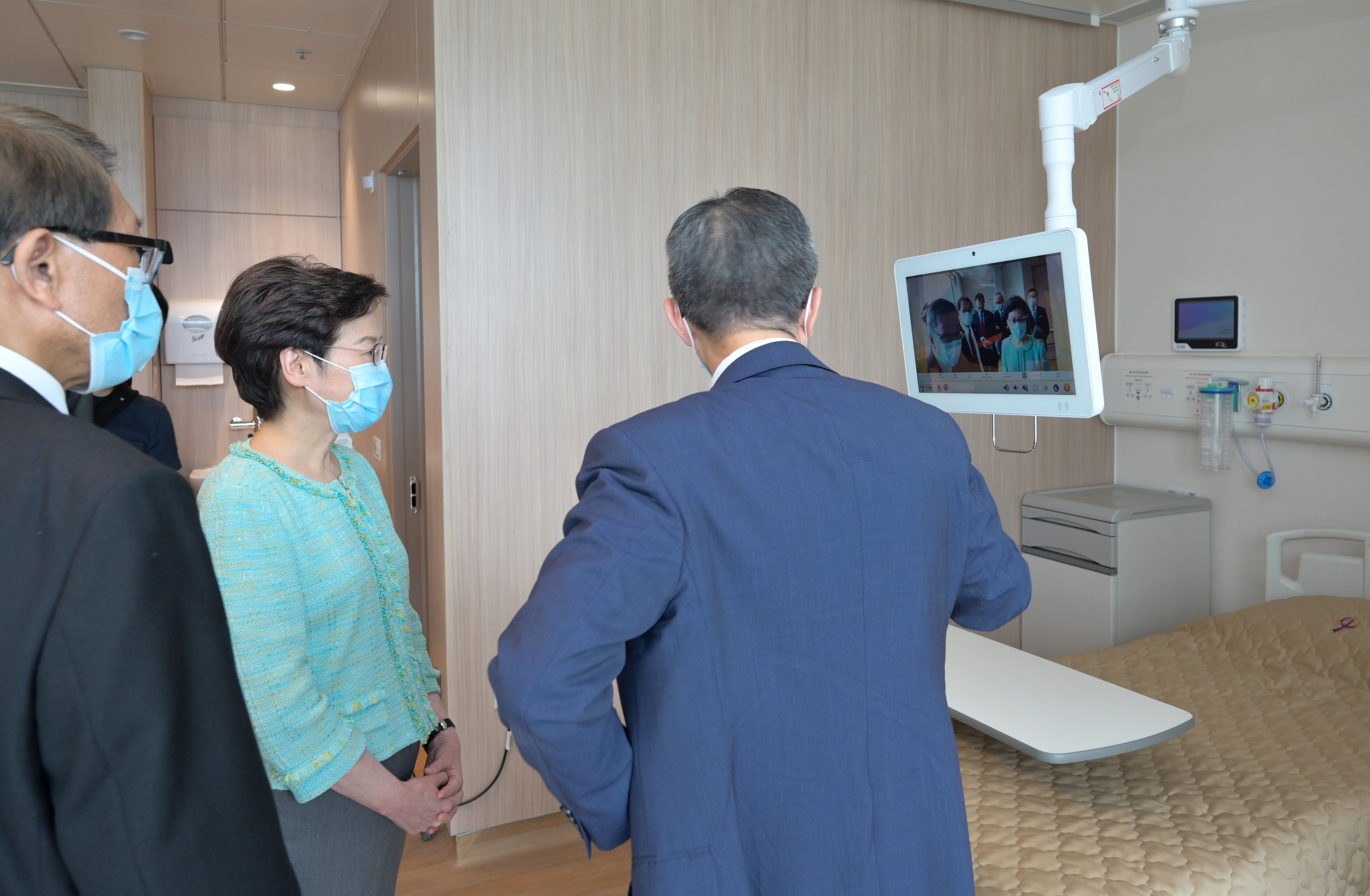 行政長官林鄭月娥參觀醫院病房,房內病床均設有娛樂資訊屏幕,可用作上網、遠程視像探訪、遠程醫療等。