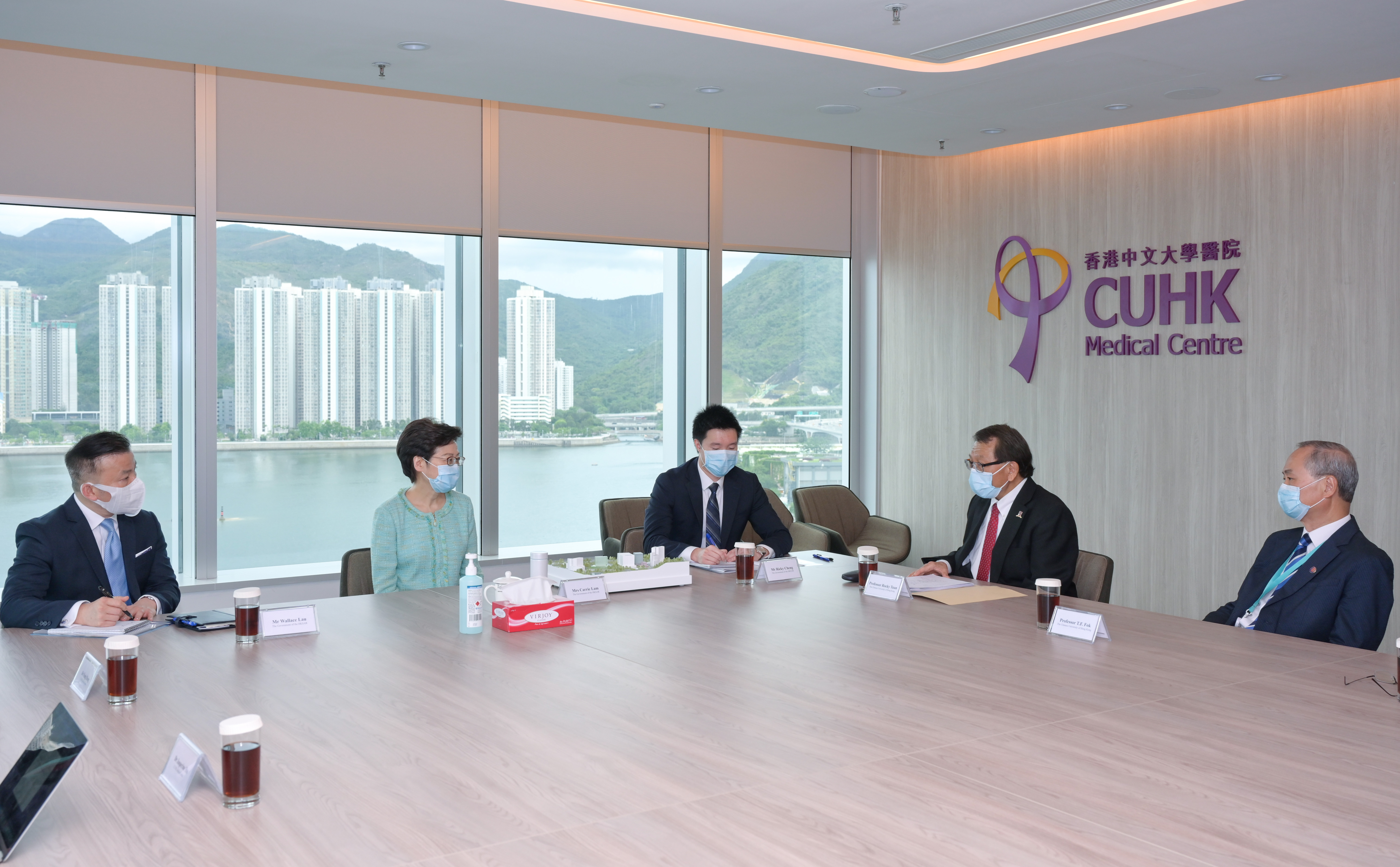 行政長官林鄭月娥(左二)聽取香港中文大學(中大)校長段崇智教授(右二)介紹中大其他醫學和醫療發展計劃。
