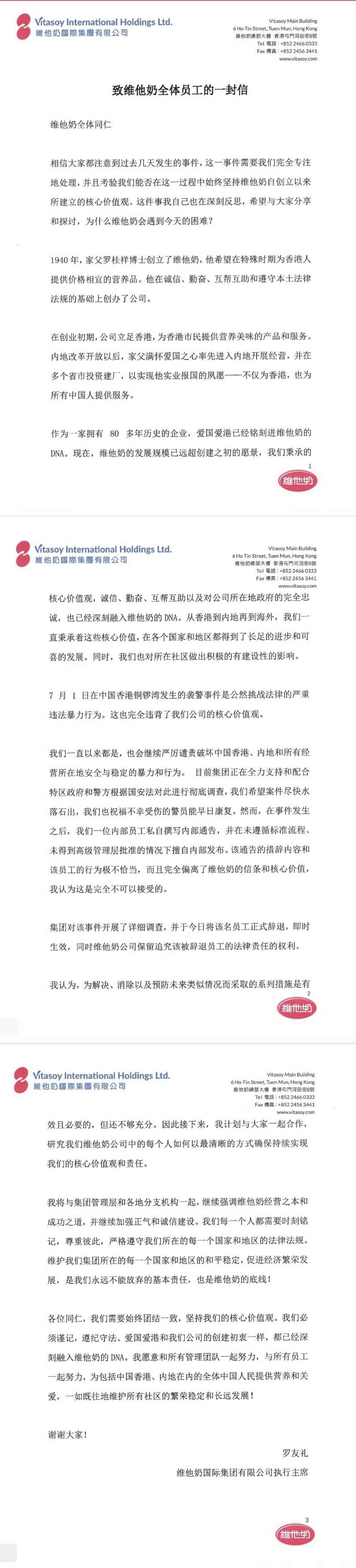 羅友禮還在信中稱,作為一家擁有80多年歷史的企業,愛國愛港已經銘刻進維他奶的DNA。他強調,嚴格遵守所在每一個國家及地區的法律法規,是集團永遠不能放棄的基本責任,也是維他奶的底綫。
