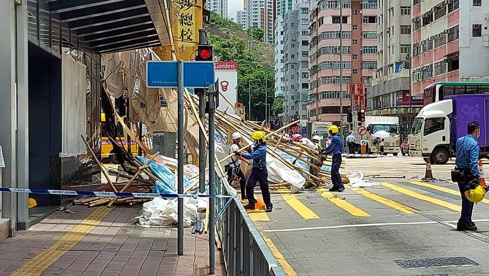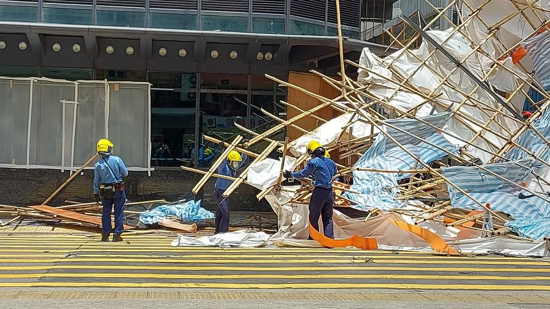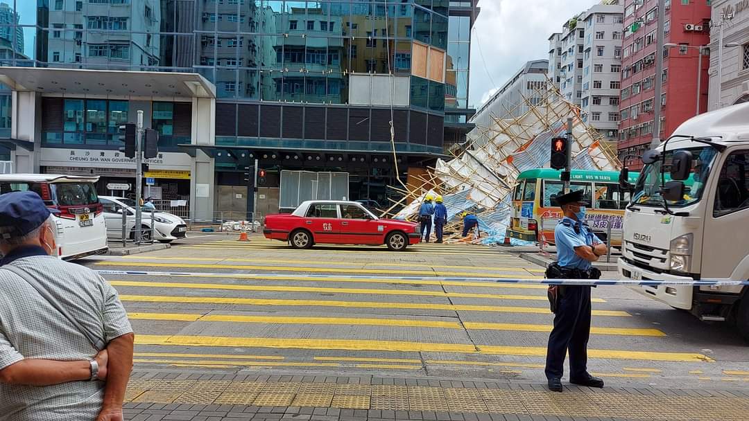 今日(7日)早上10時許,深水埗長沙灣政府合署外牆一幅約15米乘20米棚架搖搖欲墜,有途人發現報警,未幾棚架墮下路面,橫亙長沙灣道和欽州街交界,幸無人被擊中。消防員到場將棚架切斷,有待工人清理,現場部分路面需封閉。