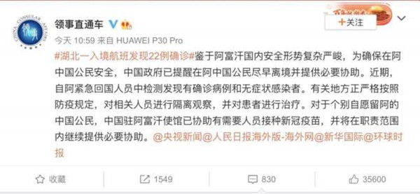 據@領事直通車微博7日消息,鑑於阿富汗國內安全形勢複雜嚴峻,為確保在阿中國公民安全,中國政府已提醒在阿中國公民盡早離境並提供必要協助。近期,自阿緊急回國人員中檢測發現有確診病例和無症狀感染者。有關地方正嚴格按照防疫規定,對相關人員進行隔離觀察,並對患者進行治療。對於個別自願留阿的中國公民,中國駐阿富汗使館已協助有需要人員接種新冠疫苗,並將在職責範圍內繼續提供必須協助。