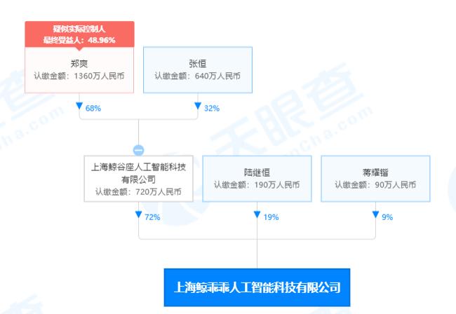 上海鯨乖乖人工智能科技有限公司成立於2019年,該公司最大股東為上海鯨谷座人工智能科技有限公司,後者由鄭爽、張恒共同持股。