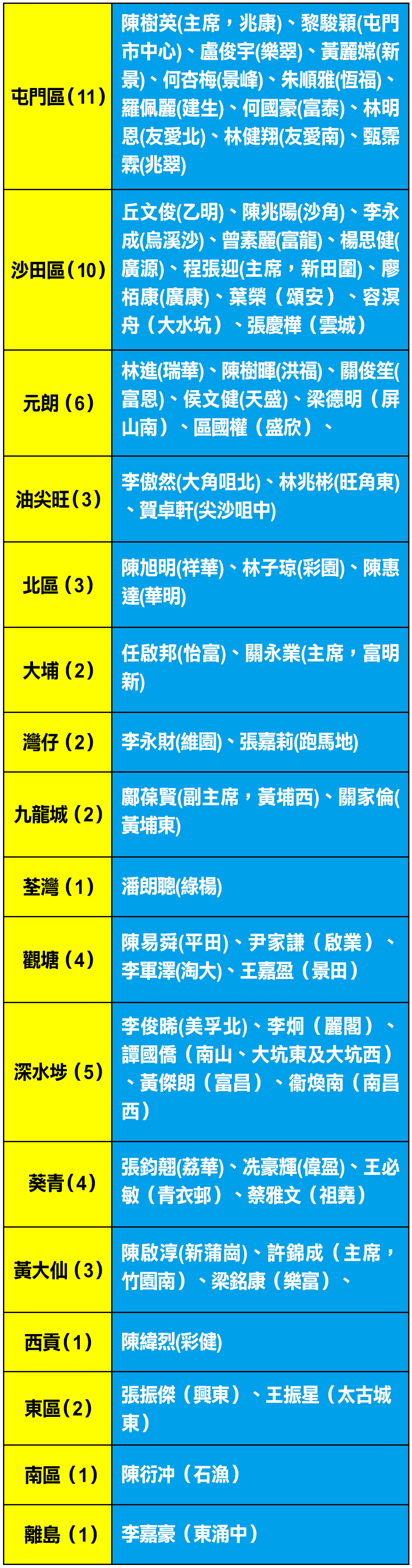 另外,北區陳旭明、陳惠達、林子琼;深水埗李俊晞、張鈞翹;油尖旺李傲然、賀卓軒;元朗林進、陳樹暉;大埔任啟邦、關永業;觀塘陳易舜、灣仔李永財等,都分別从昨晚起陸續表示辭任區議員。