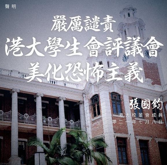 民建聯立法會議員、香港大學校董會成員張國鈞發表嚴正聲明,嚴厲譴責港大學生會評議會美化恐怖主義。他對於香港大學學生會昨日在網上發布的一則有關其所屬評議會於昨日召開緊急會議的報道,內容指該次評議會會議在開始時先為7月1日發生的刺警案中的嫌疑恐怖份子梁健輝「默哀」一分鐘,更荒謬地通過所謂「對梁健輝逝世深表悲痛」議案,聲稱「感激他為香港所作出的犧牲」,有關措辭完全巔倒黑白。