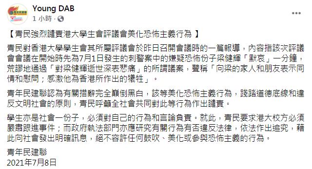 青年民建聯今日(8日在)在社交媒體發聲明,指青民對香港大學學生會其所屬評議會於昨日召開會議時的一篇報道,內容指該次評議會會議在開始時先為7月1日發生的刺警案中的嫌疑恐怖份子梁健輝「默哀」一分鐘,荒謬地通過「對梁健輝逝世深表悲痛」的所謂議案,聲稱「向梁的家人和朋友表示同情和慰問;感激他為香港所作出的犧牲」。