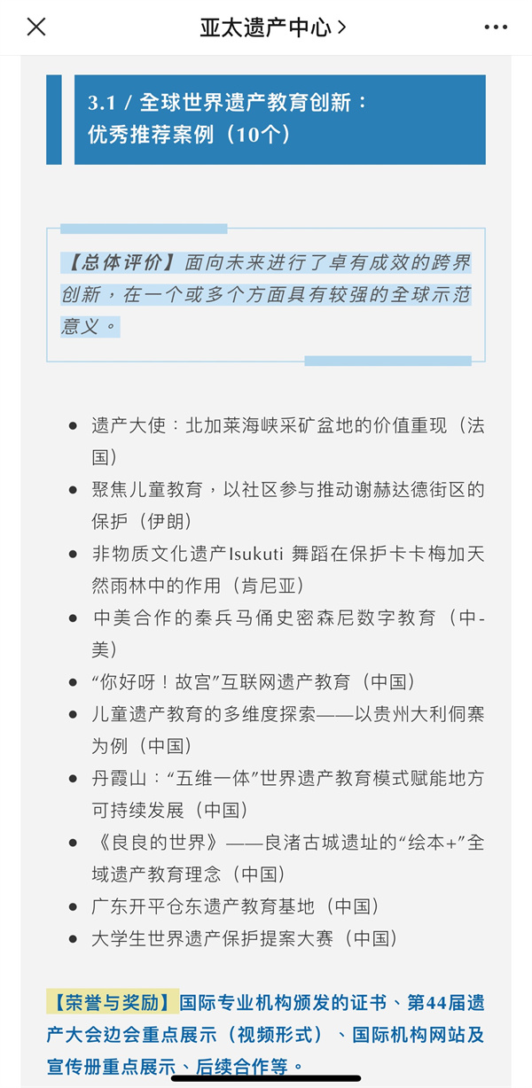 全球世界遺產教育創新案例徵集活動是由聯合國教科文組織亞太遺產中心於今年5月發起的國際徵集項目,該項目是第44屆世界遺產大會「面向未來的世界遺產教育」的活動之一,旨在聚焦世界遺產教育的跨界合作與模式創新,在全世界範圍內徵集評選出具有時代前瞻性和示範意義的遺產教育案例,以推動有關國際經驗分享和合作,助力遺產地可持續全面發展。本次活動有來自五大洲近百個作品參評,最終評選出全球優秀推薦案例10個,推薦案例12個。獲評案例將在第44屆遺產大會邊會上進行重點展示,並頒發國際專業機構頒發的證書。此外,丹霞山科普志願者案例也受邀將在第44屆世界遺產大會上進行展示。