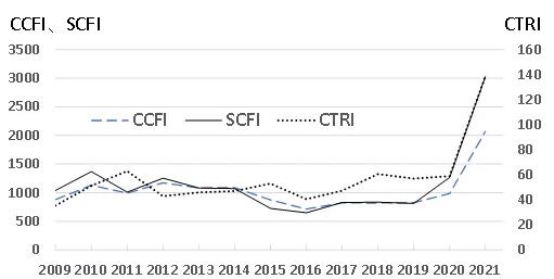 實際上,2020年6月至今,全球集裝箱海運市場呈現運價強烈上漲的態勢。集裝箱期租價格指數CTRI 在2021年7月2日來到了236.63,創歷史新高。同一天,上海航運交易所給出的中國出口集裝箱運價指數CCFI為2653.32、上海集裝箱運價指數SCFI為3905.14,同樣創出歷史新高。