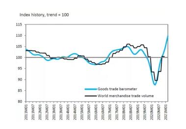 世界貿易組織WTO發布報告稱,到2021年5月,全球貨物貿易量已經克服了新冠大流行因素的影響,恢復到2019年的水平。預計2021年全球貨物貿易對比2020年,增幅將達到8%,貨物貿易指數GTB達到109.7,創下2011年以來的最高值。