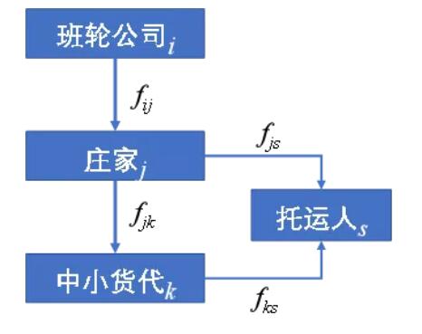 這樣的貨代市場結構,形成了不同的集裝箱海運價格,包括班輪運價fij、貨代直客運價fjs、貨代同行運價fjk以及貨代零售運價fks等。其相互關係如圖3所示。