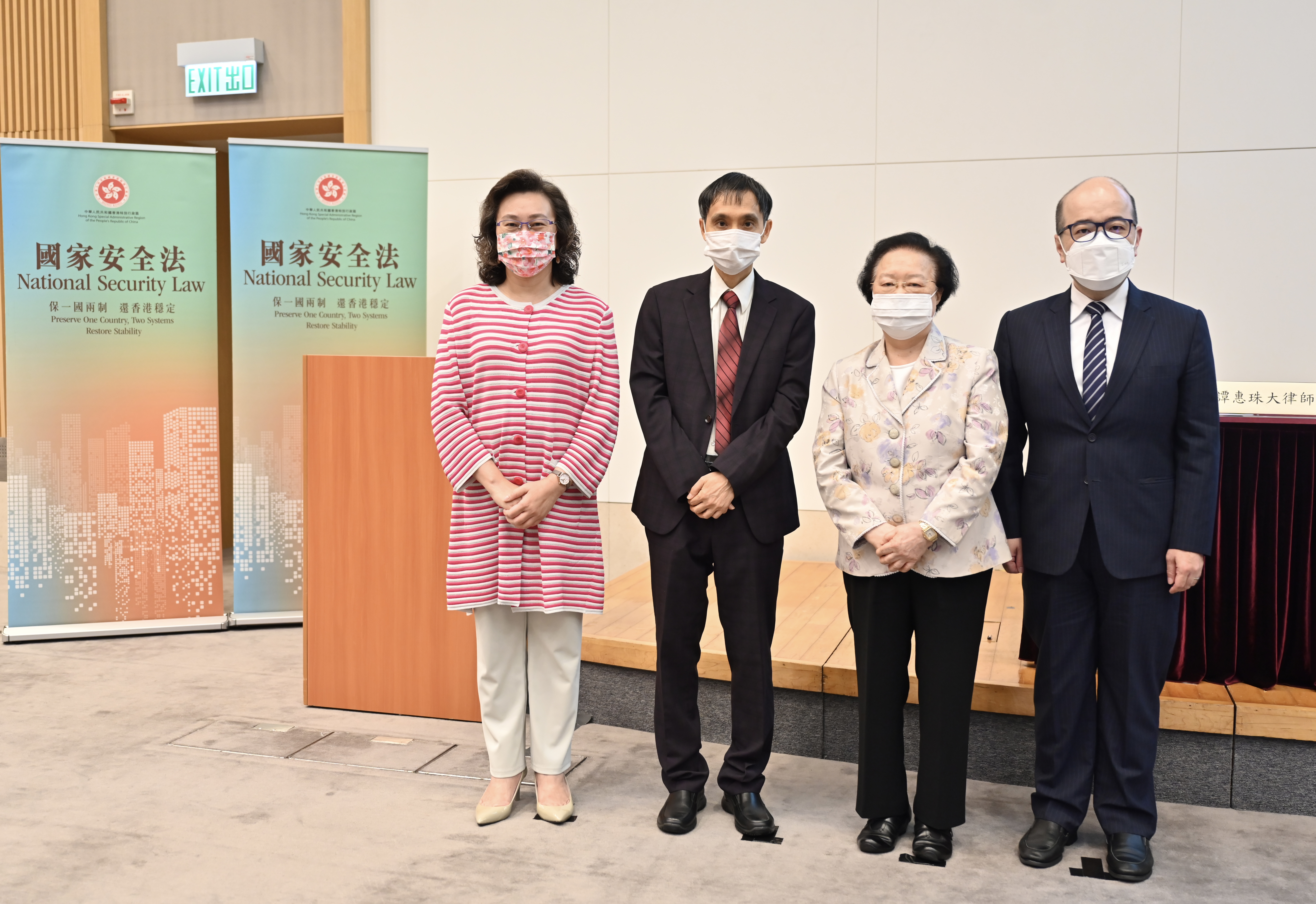 香港基本法委員會副主任譚惠珠(右二),香港大學法律學院教授、香港基本法委員會委員陳弘毅教授(左二),公務員事務局常任秘書長楊何蓓茵(左一),公務員事務局副秘書長潘偉榮(右一)出席講座。