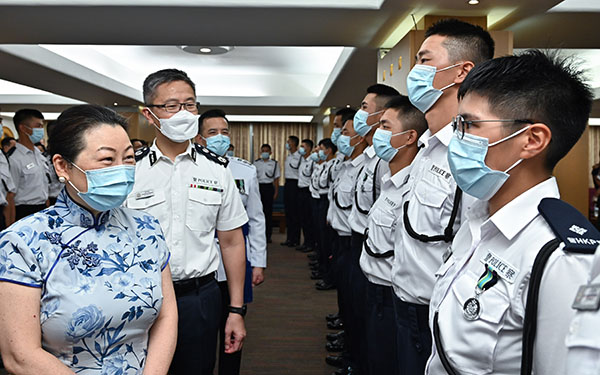 律政司司長鄭若驊在警務處處長蕭澤頤陪同下與結業學員會面。