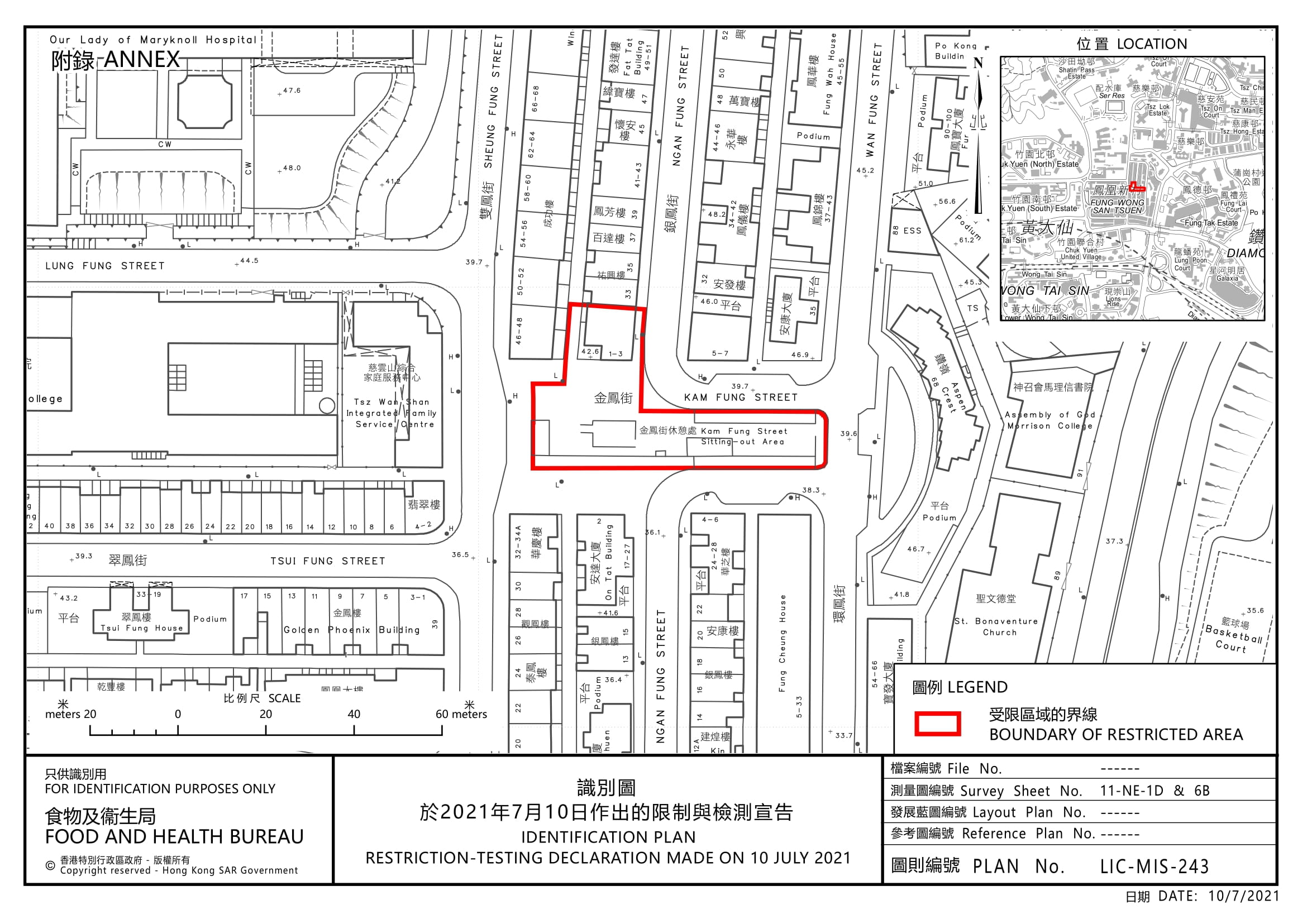 政府今日(10日)引用《預防及控制疾病(對若干人士強制檢測)規例》第599J章作出限制與檢測宣告,由下午7時30分起限制在黃大仙金鳳街1至3號內的人士須留在其處所並接受強制檢測;受檢人士須在其處所等候直至「受限區域」內所有已識別受檢人士完成檢測,而相關檢測結果亦已獲大致確定,方可離開其處所;政府目標是在明日(11日)上午約7時完成行動。