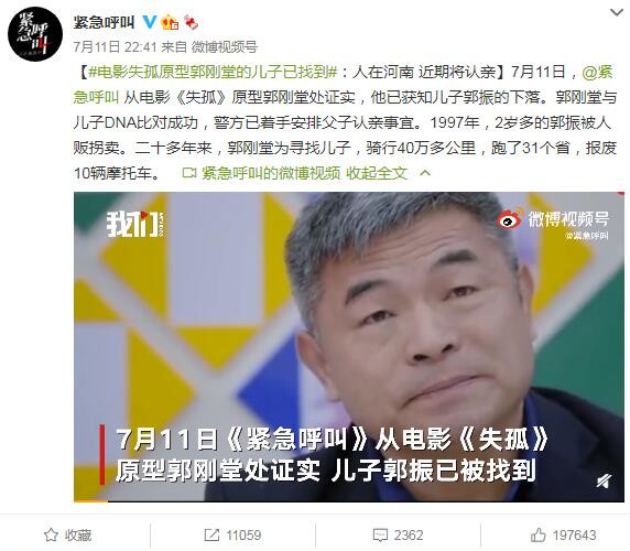 7月11日晚,據內地媒體消息,劉德華、井柏然曾主演的電影《失孤》中「父親原型」郭剛堂證實,其已獲知兒子郭振的下落。