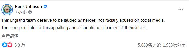 對此,約翰遜發推文稱:「這支英格蘭球隊值得英雄般的稱讚,而不是在社交網絡上受到帶有種族色彩的侮辱。」「這場可怕的網暴的責任人應該感到羞恥。」
