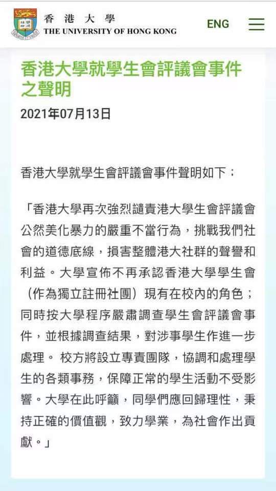 香港大學今天(13日)發表聲明,表示不再承認香港大學學生會作為獨立註冊社團現有在校內的角色;會按大學程序,嚴肅調查學生會評議會事件,並根據調查結果對涉事學生作進一步處理。