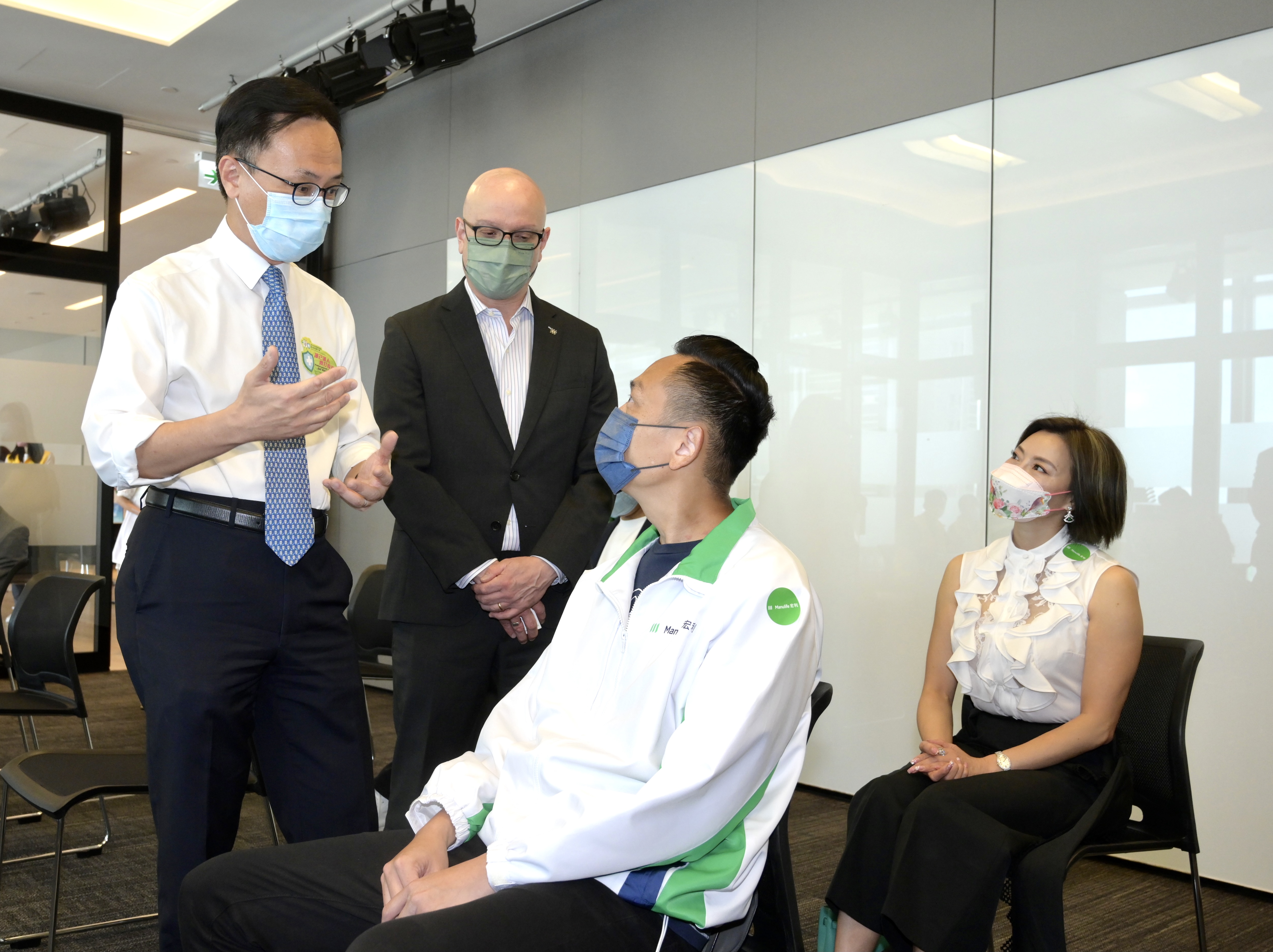 聶德權與一名準備接種新冠肺炎疫苗人士交談,旁邊為宏利香港首席行政總監戴明鈞。