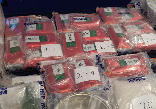 毒品調查科(行動)總督察葉秀蘭表示,在本月11日晚上警員在元朗馬鞍崗村一村屋外截查兩名男子,在其中一人身上搜出1磚約1公斤的可卡因,其後到其租住的村屋內,發現18包、共重18公斤以茶葉錫紙袋包裝的冰毒,和4包以可再封膠袋包裝、共重約3.5公斤的冰毒。另外搜出800枝、每枝重1公斤的牛油果煮食油,在其中130枝中發現有液態冰毒,估計可提煉39公斤冰毒。在調查期間警方發現一間位於旺角界限街的劏房單位與案有關,再搜出5磚共重約5公斤的可卡因。案中共檢獲65.5公斤毒品,總值4020萬元。案中拘捕一名南亞裔男子和一名本港男子(23歲和22歲),明日(14日)在屯門裁判法院提堂。