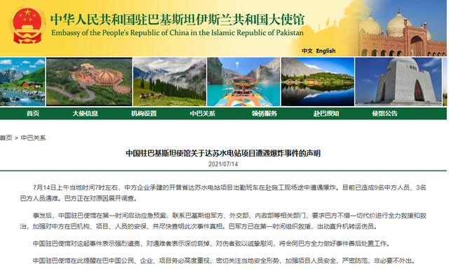 中國駐巴基斯坦使館7月14日發布關於達蘇水電站項目遭遇爆炸事件的聲明,全文如下:
