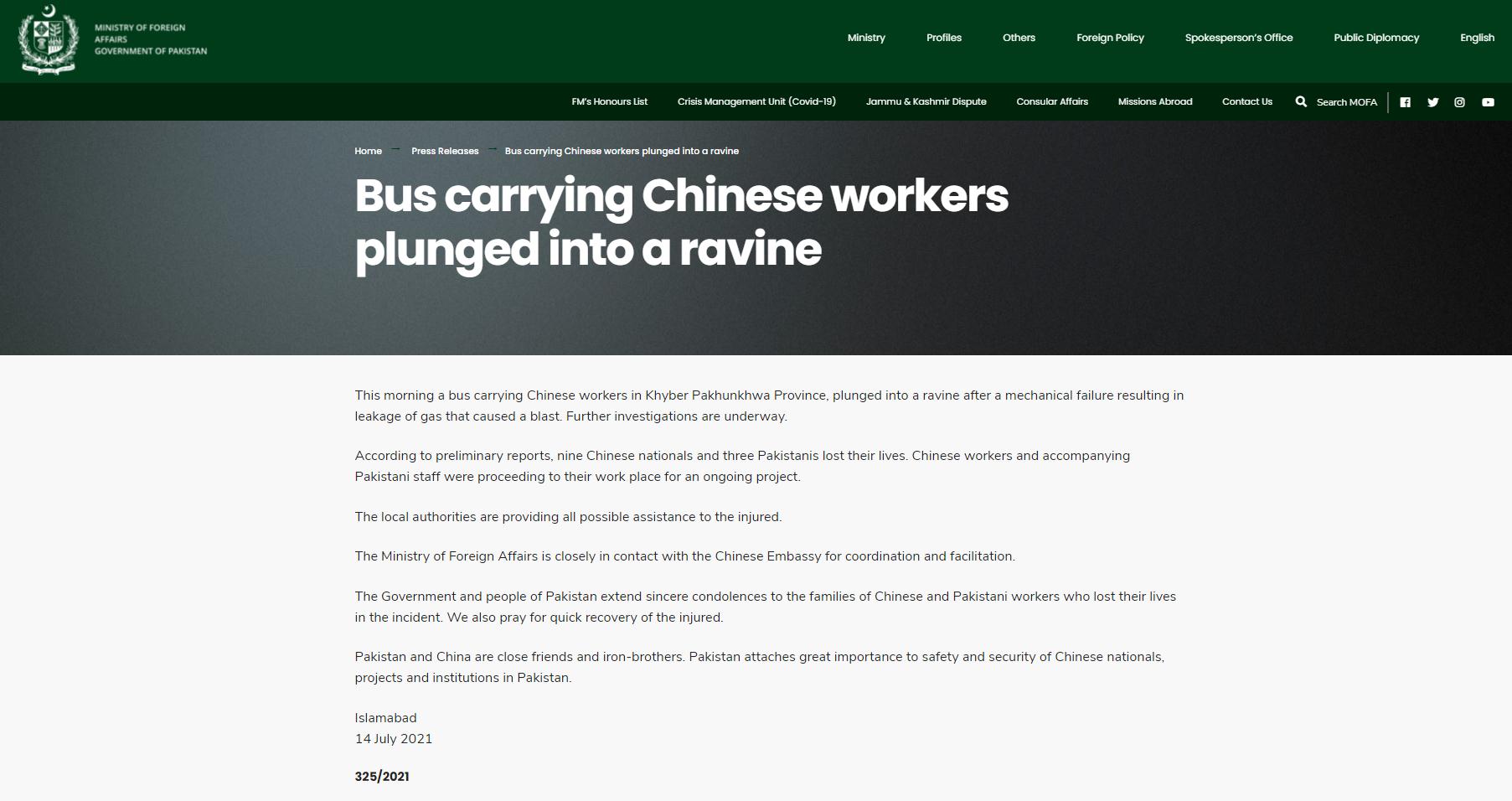 14 日下午,巴基斯坦外交部在其官網發布聲明,稱「汽車因機械故障導致氣體洩漏引發爆炸後墜入深谷」,並表示正在對此事進行進一步的調查。
