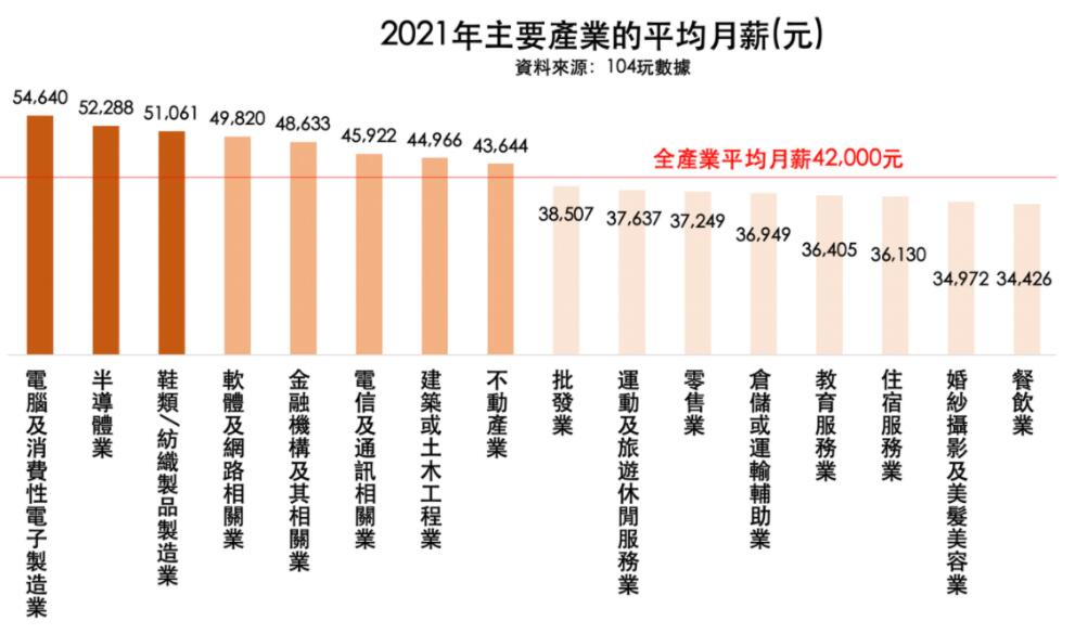 據東森新聞報道,台灣104人力銀行調查顯示,不分產業、職務、年資,2021年台灣「全體62產業平均月薪為4.2萬元(新台幣,下同)」,其中有22個產業(約3分之1)高於全體平均,40個產業(約3分之2)低於全體平均。