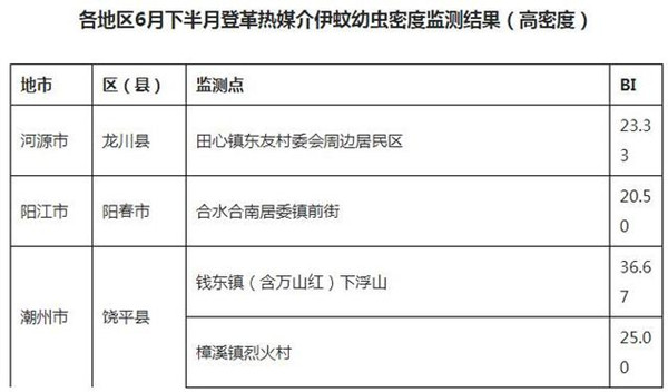 河源市龍川縣田心鎮東友村委會周邊居住區、陽江市陽春市合水合南居委鎮前街、潮州市饒平縣錢東鎮(含萬山紅)下浮山和樟溪鎮烈火村等地,登革熱媒介伊蚊幼蟲監測結果為高密度區。