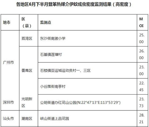 其中,廣州市荔灣區東沙街南漖小學,番禺區石基鎮蓮塘村、石樓鎮亞運城運動員村一區和三區、小谷圍街南亭村,深圳市光明新區公明街道辦紅花山公園等地登革熱媒介伊蚊成蟲監測結果屬於高密度區。