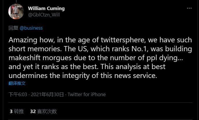「令人驚訝的是,在推特時代,我們的記憶如此短暫。排名第一的美國,由於死亡人數眾多而建造臨時停屍房,但它仍然排名最好。這種分析破壞了這家新聞機構的誠信。」