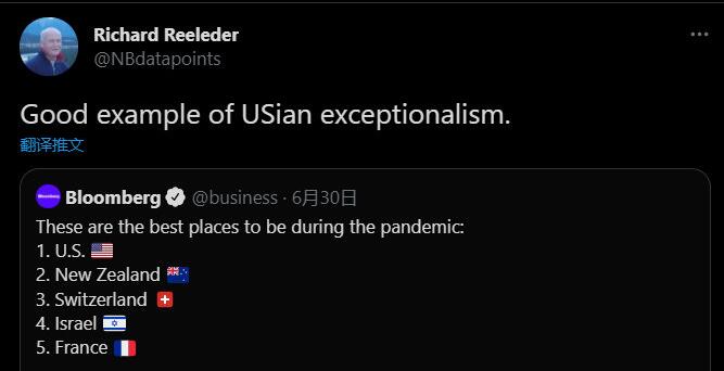 就在彭博社這份報告的推文下,網友們紛紛表示不解,「美國是新冠肺炎死亡人數最多的國家。說它是最好的地方?這什麼邏輯?」