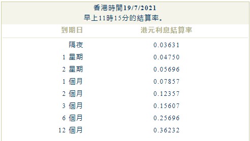 短線拆息方面,隔夜HIBOR跌0.11點子至0.03631%;1星期HIBOR跌0.14點子至0.0475%;2星期HIBOR升0.07點子至0.05696%。中長線拆息方面,3個月期HIBOR跌0.23點子至0.15607%;6個月期HIBOR無升跌報0.25696%;12個月期HIBOR升0.07點子至0.36232%。