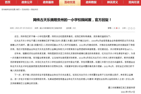 通報提到,近年來,隨着經濟社會的快速發展,特別是脫貧攻堅工作的紮實推進和城鎮化建設的快速推進,紅光古天樂小學生源逐年減少,為進一步改善農村教育環境,有效整合教育資源,讓當地學生接受更好的教育,2014年9月將紅光古天樂小學併入教學環境更好、教學資源更優的寄宿制學校蘭生小學。並將紅光古天樂小學校舍委託蘭生村村委會代管,存在閒置現象。經遵義市智力支邊辦溝通聯繫,慈恩基金會和古天樂先生對學生能接受更優質的教育表示欣慰和支持,對援建學校部分校舍閒置的情況表示理解。2021年4月,該校舍正式移交蝦子鎮人民政府管理。