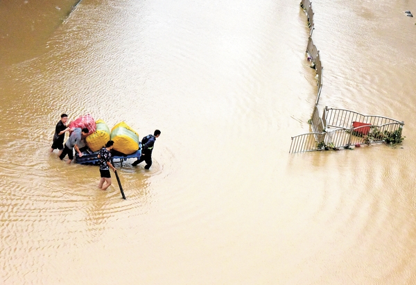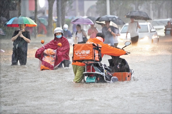 20日傍晚鄭州市民在暴雨中趟水前行。中新社