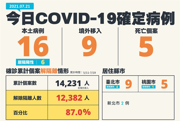 指揮中心表示,今日新增的6例本土病例(其中6例為居家隔離期間或期滿檢驗陽性者),為11例男性、5例女性,年齡介於20多歲至70多歲,發病日介於今(2021)年7月12日至7月19日。今日新增的9例境外移入個案,均為男性,年齡介於20多歲至70多歲,分別自菲律賓(2例)、印尼(7例)入境,入境日介於6月24日至7月20日。