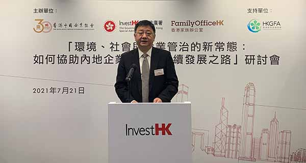 頂圖:投資推廣署與香港中國企業協會今日(21日)合辦網上研討會,以環境、社會與企業管治為題,投資推廣署署長傅仲森於會上致辭。