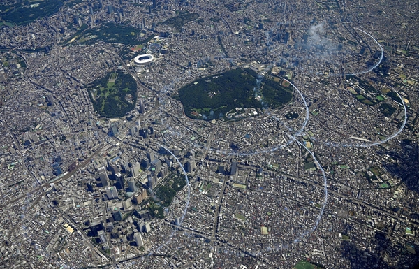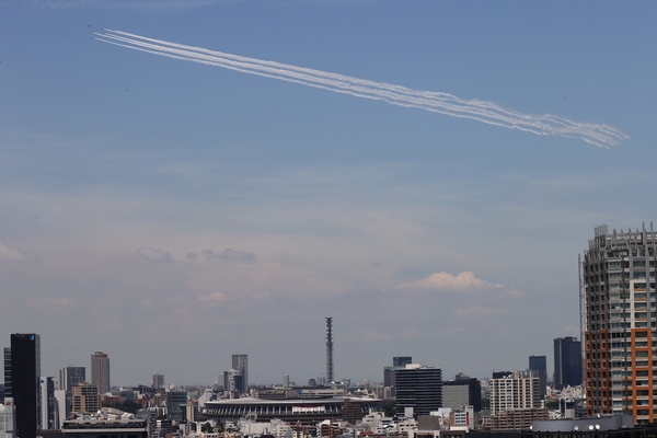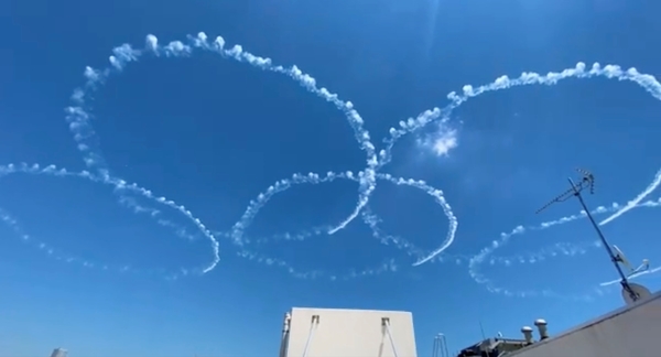 在東京盤旋的「藍色衝擊波」於當天中午12點50分前後在國立競技場附近上空畫出五環。正午過後,逾500人聚集在國立競技場附近的人行道上,並拿出相機和手機等待。看到藍色機身後,響起歡呼聲。東京都中野區的高中生遠藤悠里(17歲)興奮地說:「這是一輩子難得一見的盛況。我想着一定要現場看。」