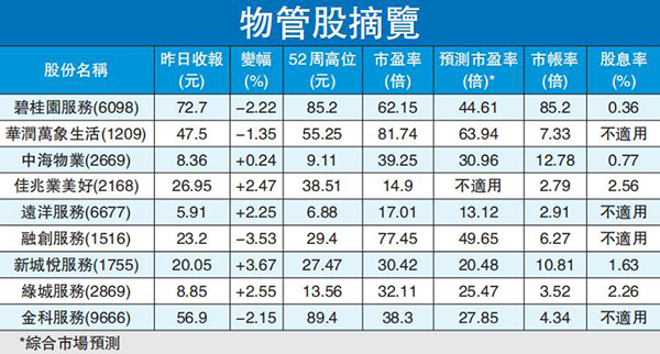 早前多隻物管股發盈喜,包括金科服務(9666)、融創服務(1516)及綠城管理(9979)等,利好板塊的投資氣氛。近日市況波動,部分物管股仍然逆市造好,昨日新城悅服務(1755)、綠城服務(2869)、佳兆業美好(2168)、遠洋服務(6677)、中海物業(2669)分別升3.67%、2.55%、2.47%、2.25%、0.24%。