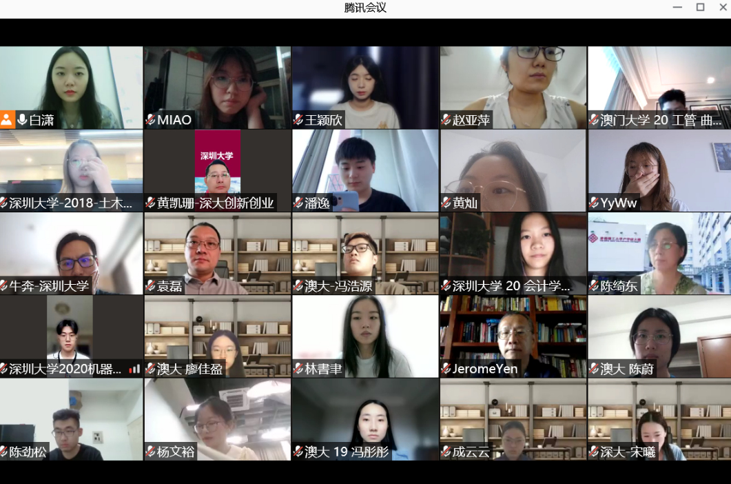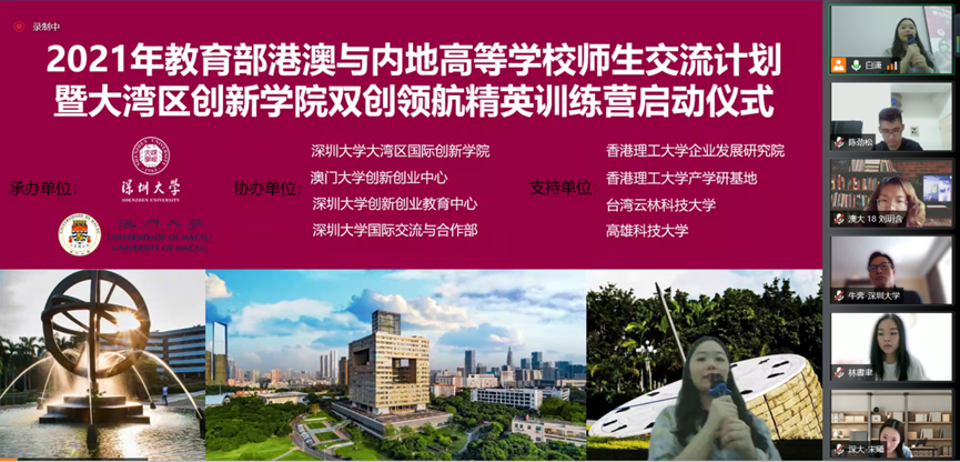 7月18日上午,2021年教育部港澳與內地高等學校師生交流計劃暨大灣區國際創新學院雙創領航精英訓練營正式啟動。該項目是教育部港澳與內地高校師生交流計劃的立項資助項目。2019年深圳大學大灣區國際創新學院獲得該項目的全額資助,2021年再次獲批教育部全額資助。本次活動吸引了兩岸三地包括澳門大學(22人)、香港理工大學(15人)、台灣雲林科技大學(15人)、高雄科技大學(2人)、深圳大學(20人)等5所高校七十餘名師生報名參加。