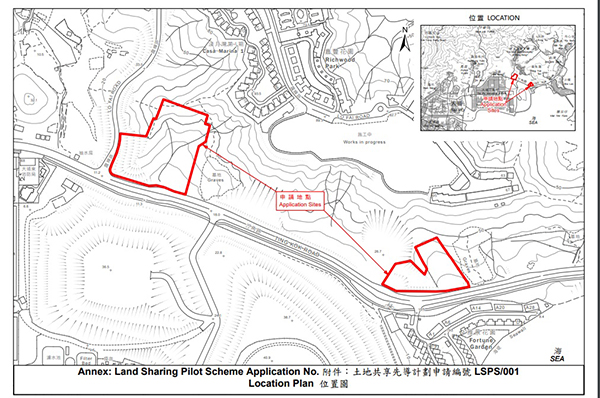 發展局今日(22日)公布接獲首宗土地共享先導計劃申請。申請地點位於大埔露輝路及汀角路,佔地約3.2公頃,涵蓋兩個私人地段及毗連的政府土地。有關土地坐落現時劃為「綠化地帶」及「道路」的地帶。申請涉約1 149個公營房屋/「首置」單位(具體資助房屋類別將由政府決定)及493個私營房屋單位和輔助設施,總樓面面積約85 000平方米。申請人為金鹿置業有限公司,其母公司為南豐發展有限公司。