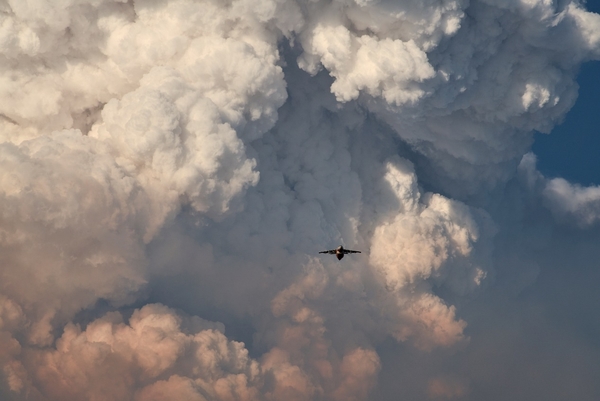 當地時間7月15日,在美國俄勒岡州,一架消防飛機在向山火投放阻燃劑後,在巨大的煙塵中返回基地。這場山火在成為該州1900年以來第6大山火之餘,也是全美目前最大型山火之一。